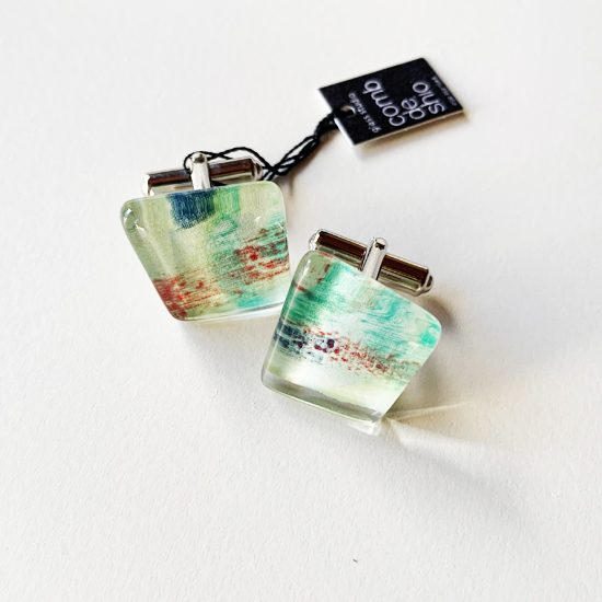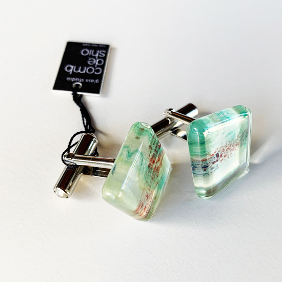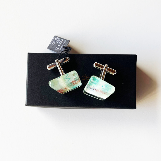 ガラス作家Isakoが、独自の手法で、透明なガラスから彩色・焼成を繰り返し、ひとつひとつ手作業で作り上げた、美しい1点もののガラスのカフスボタン。