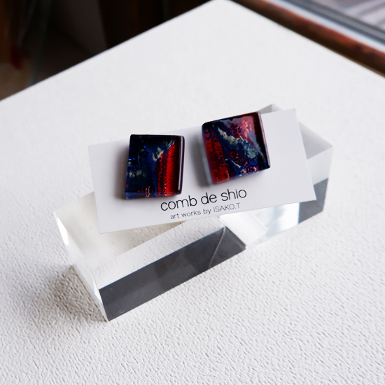 ガラス作家Isakoが、独自の手法で、透明なガラスから彩色・焼成を繰り返し、ひとつひとつ手作業で作り上げた、美しい1点もののガラスイヤリングです。