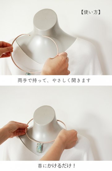 パッと開いて、簡単に身に着けられる、コムデシオのオリジナル革チョーカーです。