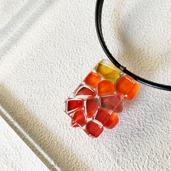 コムデシオでは、身に着けやすい様にガラス自体の重さも軽減できるように工夫しています。なかでも、この革チョーカーは、チョーカー部分がガラスの重さをさらに分散!ご愛用者の皆様「軽い!何も感じない位!着けていないみたい!」と、大好評です。気軽に、楽に、おしゃれしたい!という方は、是非、トライしてみて下さい。