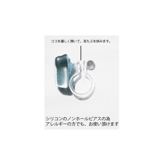 シリコンのノンホール・ピアスタイプを使用している為、身に着けると金具が見えにくく、ピアスの様な装着感です。長時間着けていても、痛くなりにくく(個人差があります)金属アレルギーの方でも、安心してお使い頂けます。